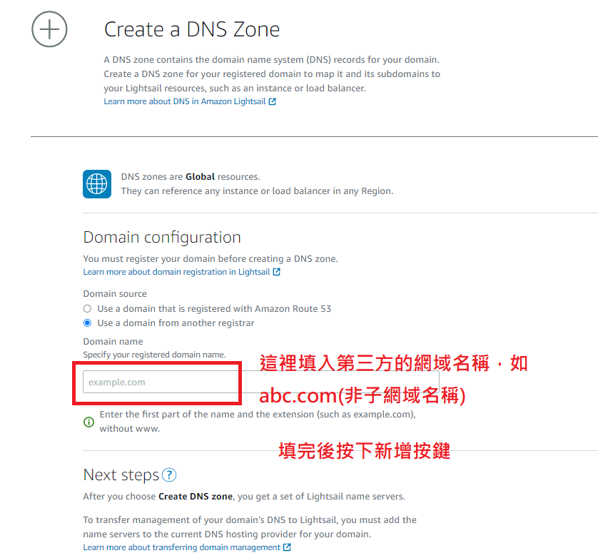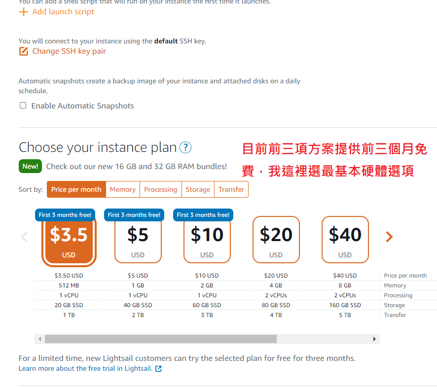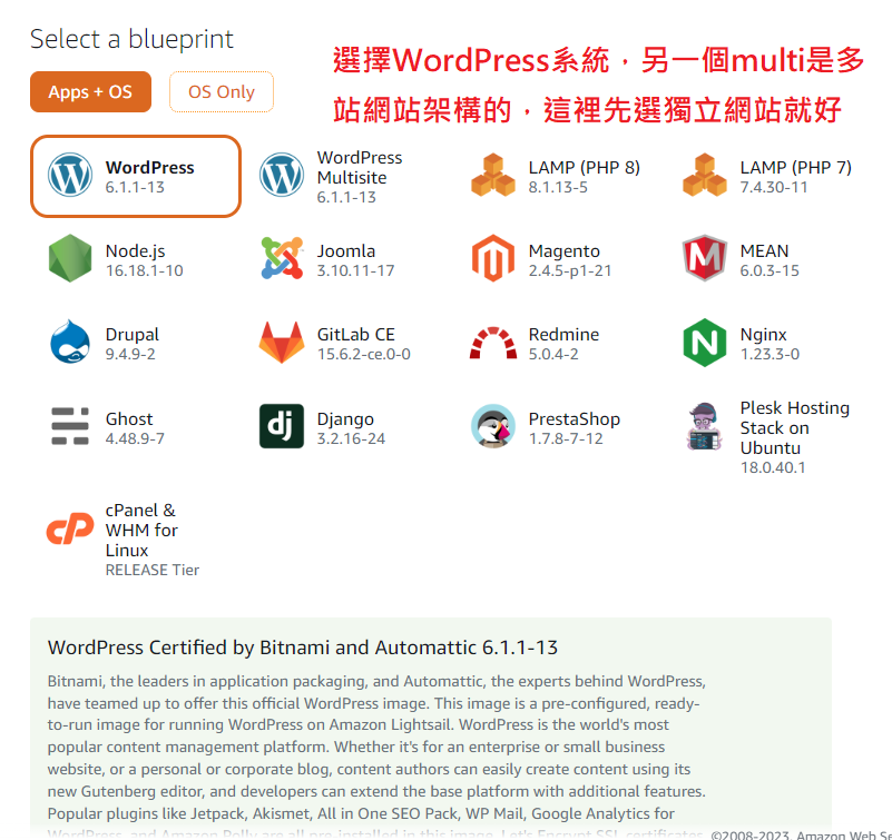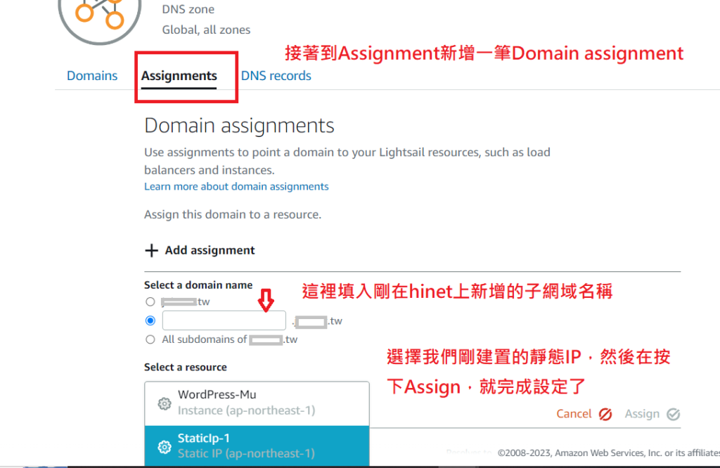 在AWS的Lightsail中建置WordPress網站 Post author:honeststore Post published:2023 年 2 月 18 日 Post category:AWS / WordPress Post comments:0 Comments 本篇文章介紹如何在 AWS的Lightsail中建置WordPress網站,最近接到客戶他們有租用AWS雲端主機,想在上面架設網站,客戶已經有一個Hinet網站,想架設子網域網站,請我這邊幫忙作業,接下來我會一步步教學各位如何操作。 文章目錄標題 註冊AWS帳號建置Lightsail實體設定固定IP到Hinet網域設定子網域AWS的Lightsail端設定DNS zone安裝SSL憑證 註冊AWS帳號 註冊AWS帳號我就不多說了,網路上有不少文章有介紹,各位只要上網搜尋就會有很多文章說明。 建置Lightsail實體 當按下Create an instance後,會出現下面選項,我直接用圖示教學 設定固定IP 到Networking建置靜態IP,若是第一次還沒有建立靜態IP,到這裡會看到一個static IP選項,直接點選,前選擇剛剛建立的實體(instance),然後給它一個名稱,我這裡用預設,最後按下新增,這樣就建立完成一個靜態IP了。 到Hinet網域設定子網域 登入Hinet網域後,因我這邊要設定子網域,所以選擇”更新DNS紀錄”,進入後選擇新增一列,並填入子網域名稱、選擇A Record及剛剛在lightsail建立的靜態IP,然後再按下送出資料,這樣就完成了子網域的DNS設定。 子網域的DNS設定大約要10分鐘到30分鐘內左右的時間生效。 AWS的Lightsail端設定DNS zone 在設定好第三方網域提供的DNS後,接著在AWS的Lightsail上也要設定DNS區域,並Assign剛剛在hinet上設定的DNS指定。 到這裡為止,基本上已經完成WordPress網站的建置及DNS的指定了。若要登入WordPress網站,可以直接在瀏覽器上輸入IP就可以看到網站的頁面了。 安裝SSL憑證 各位可以看到,我們網站不可能是一個IP或是http的網址,我們希望它有https的安全性的功能。所以網站建立完成後,最後就是進到命令畫面下幾行指令,填寫一點點資料及選項,就可以完成SSL的憑證安裝了。 一般使用 Let’s Encrypt SSL 憑證都要每 90 天更新一次,這裡提供安全SSL憑證安裝方法它會自動更新,所以只要安裝一次就可以了。 首先開啟 Terminal 輸入指令 sudo /opt/bitnami/bncert-tool 輸入要認證之網域 Domain list []: abc.com www.abc.com 依偏好設置導向,HTTP to HTTPS 請輸入Y,後面可以偏好設置。 Enable HTTP to HTTPS redirection [Y/n]: y Enable non-www to www redirection [Y/n]: y Enable www to non-www redirection [y/N]: n 輸入電子信箱後,同意服務條款,請輸入Y。 Do you agree to the Let's Encrypt Subscriber Agreement? [Y/n]: y 到這裡差不多大功告成了,按下 enter 繼續。 最後,確認網站是否已可使用 https 差點忘了講。要如何登入網站後台,首先在https://網域名稱/wp-admin,如下 帳號是user 密碼的話,要到Terminal輸入下列指令,就會得到一串密碼了。 cat bitnami_application_password Tags: aws, bitnami, Lightsail, WordPress Please Share This Share this content Opens in a new window Opens in a new window Opens in a new window Opens in a new window Opens in a new window Opens in a new window Opens in a new window Opens in a new window Opens in a new window Opens in a new window Read more articles Previous PostBluehost上的網站程式受感染如何處理 You Might Also Like WordPress佈景主題 2022 年 6 月 28 日 WordPress 網站搬家:從 Bluehost 搬家到 Cloudways 2021 年 3 月 21 日 氣象站偵測網站DIY-NBIoT 2022 年 5 月 15 日 發佈留言 取消回覆CommentEnter your name or username to comment Enter your email address to comment Enter your website URL (optional) 在瀏覽器中儲存顯示名稱、電子郵件地址及個人網站網址,以供下次發佈留言時使用。 Δ