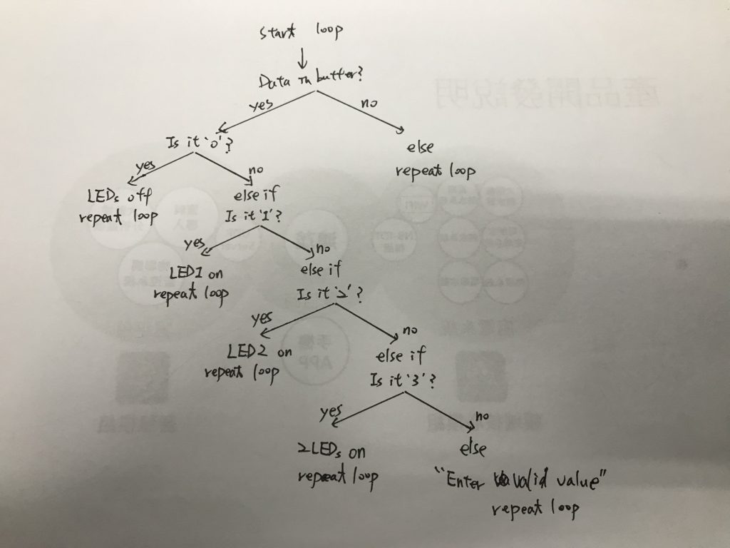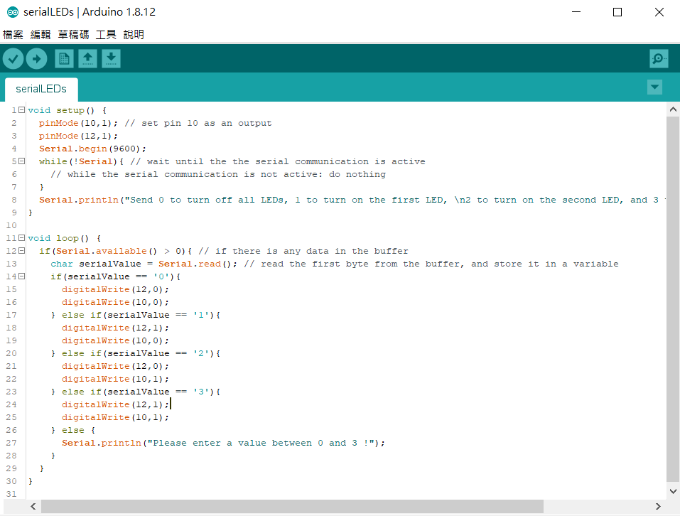 因此,第一個if(Serial.available> 0)將檢查緩衝區中是否有任何數據。如果是這樣,它將讀取第一個byte,並將其存在變數serialValue中。然後檢查剛剛讀取的值是否為’0’。請注意單引號,它表示字元0(ASCII:’0’= 48),而不是值0,因為序列埠監控視窗將其作為字串發送。如果值為’0’,它將關閉兩個LED。如果該值不是’0’,則在’ else‘部分將執行:接著檢查值是否為’1’,如果是,它將點亮第一個LED並關掉第二個LED。如果不是’1’,將檢查它是否為’2’,如果是,將打開第二個LED,然後關閉第一個LED。如果不是’2’,將檢查是否為’3’,如果是,它將同時打開兩個LED,否則,它將執行else末節中的代碼,並列印您應輸入的值。