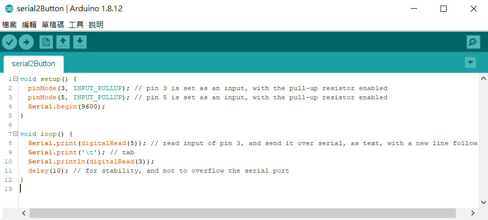 另一個特殊字元是 t(tab),讓我們用它來列印兩個開關的輸入。下面是範例serial2Buttons。上傳然後打開序列埠監控視窗來查看結果。