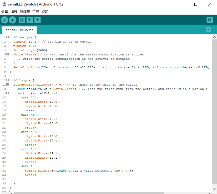 這是範例serialLEDs。編碼完後上傳後,打開序列埠監控視窗,然後嘗試送出0到3之間的值。再送出4了解它如何工作?
