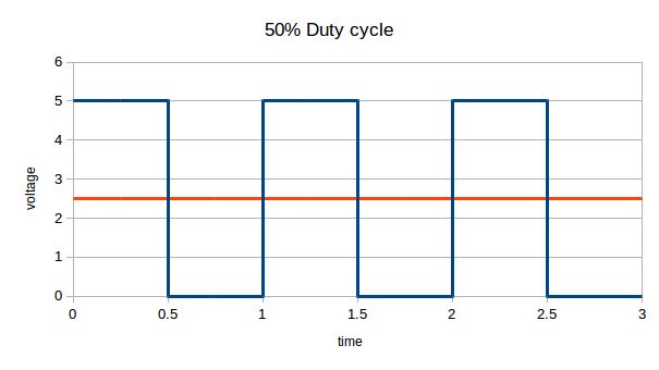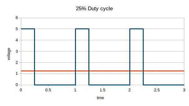 換句話說,平均電壓可以寫成工作週期乘以電源電壓。例如,工作週期為25%將是5v·0.25 = 1.25v。