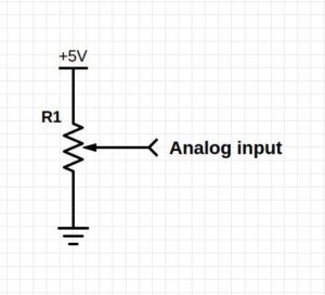如果看原理圖,可以看到2個電阻。R1是電位器右引腳與滑動接點(中心引腳)之間的電阻,R2是左引腳與滑動接點之間的電阻。還要看一下公式。由於我們的電位器具有固定值(例如50kΩ),因此R1 + R2始終為50kΩ,而R2可以在0Ω和50kΩ之間變化。(如果R2 = 50k,則R1 = 0,反之亦然)因此,該分數始終將得到一個介於0和1之間的數字。將該比率乘以5V(Vsubin / sub),你將獲得一個介於0V和0V之間的電壓。輸出電壓為5V。該電壓可由Arduino的ADC(類比數位轉換器)讀取,並表示電位器(或推子)的位置。因此,基本上,您將左引腳接地,將右引腳連接至Arduino的5V引腳,中心引腳連接到類比輸入。(如下圖)