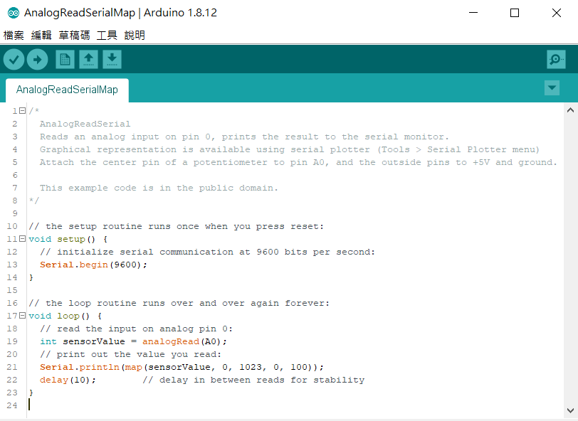 map函數的語法為:map(value,lowerLimitInput,upperLimitInput,lowerLimitOutput,upperLimitOutput) value只是要對應的值,在這種情況下,就是我們的感測器讀數。此輸入的範圍是0到1023,因此這是我們輸入的限制。我們希望輸出範圍是0到100,所以這是我們的輸出限制。這意味著,如果感測器讀取1023,則輸出值為100。