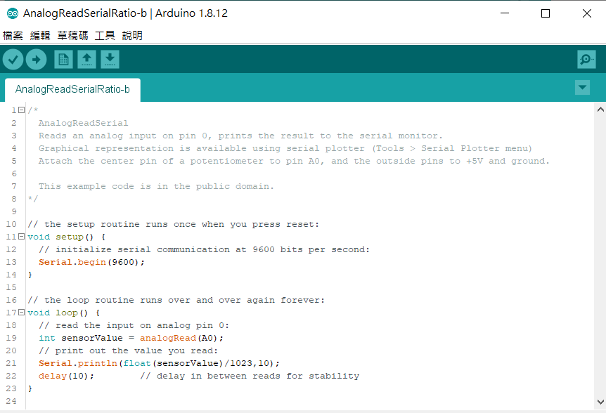 我們可以將sensorValue變數的data type更改為float,或者將值從int轉換為float。第一種方法用於AnalogReadSerialRatio-a,後一種方法用於AnalogReadSerialRatio-b。