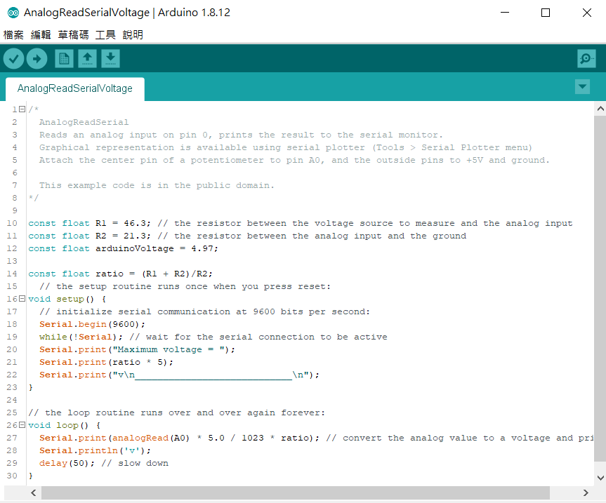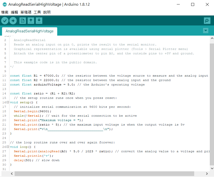 例如,測量12v時,我使用R1 = 47k和R2 = 22k。我們得到最大電壓15.87v,如果高過這個電壓,就會燒壞Arduino。