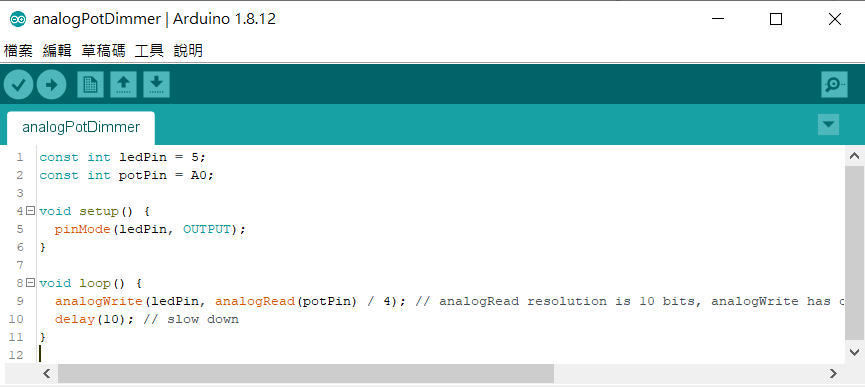 該程式碼通過序列方式將測得結果列印出來,因此打開序列埠監控視窗(CTRL + SHFT + M)或序列繪圖家(CTRL + SHFT + L)並轉動可變電阻。應該會看到0到1023之間的值。在序列繪圖家中,將delay設為10或大一點而不是1ms可能會給你帶來更好的結果。