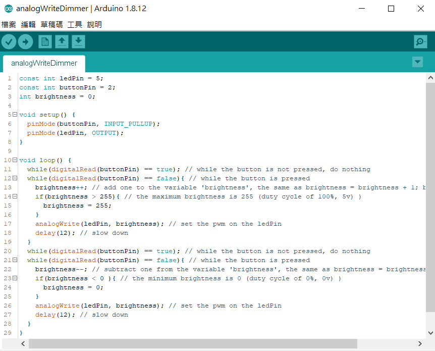 這裏加入新程式碼是analogWrite(pin,工作週期)。它只是在引腳上設置pwm的工作週期。請注意,工作週期是一個介於0到255之間的值,它對應於0%-100%