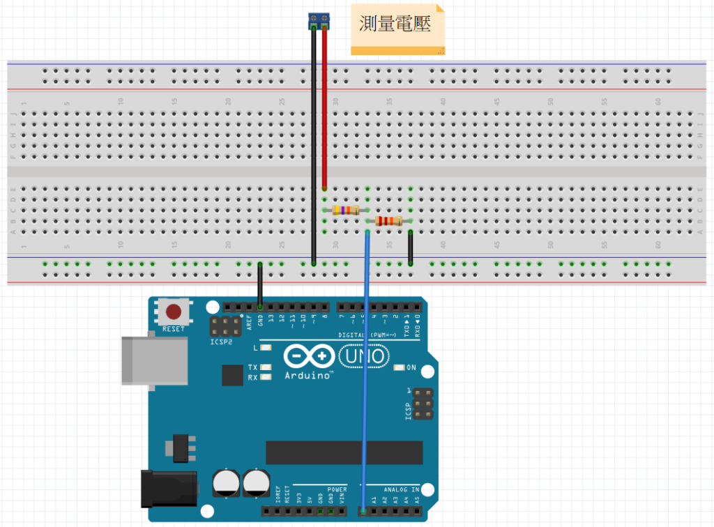 將一個電阻(R2)從GND連接到類比輸入,然後將要測量的電壓GND連接到Arduino的GND,然後將另一個要測量的電阻(R1)連接到類比引腳。(見圖)