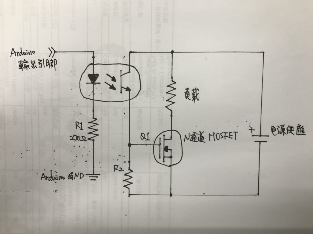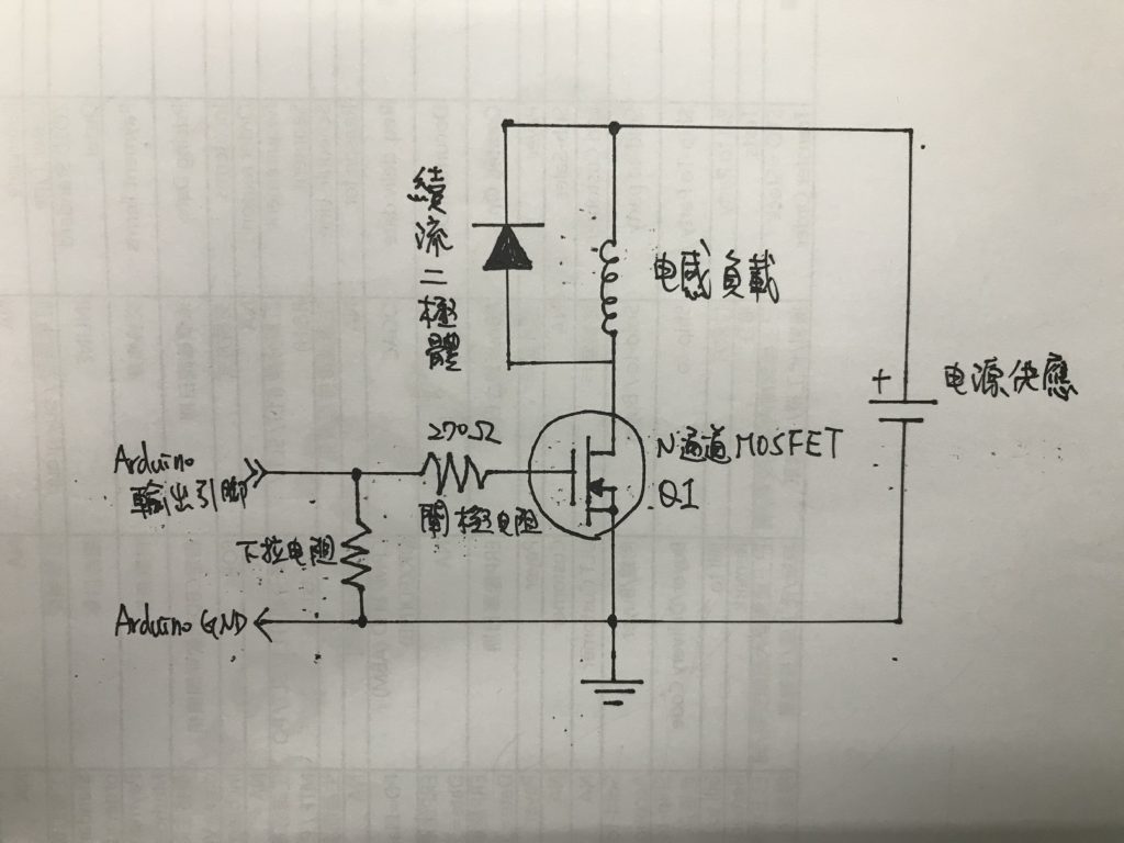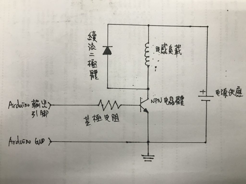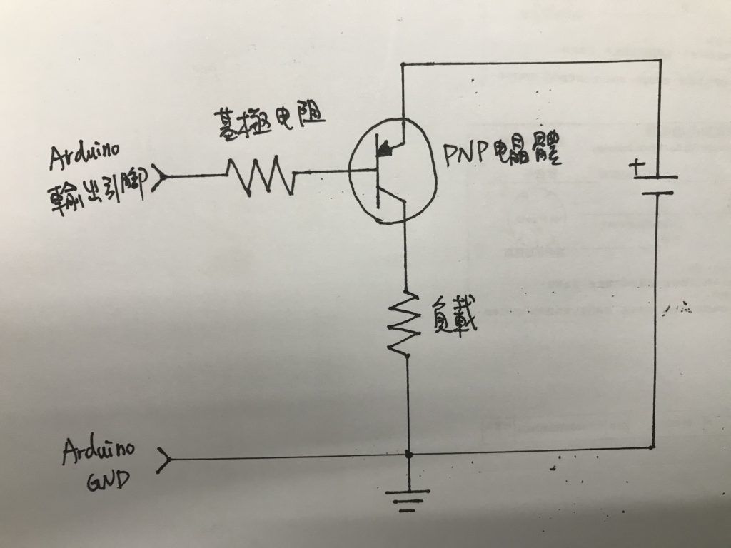 注意:Arduino的接地要跟電晶體電路的接地相連。