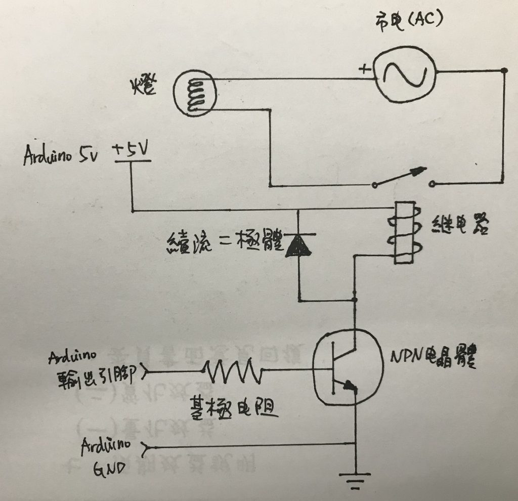 為了驅動高壓或交流負載,您需要一個繼電器。有關更多信息,請參見Arduino程式控制入門指南-繼電器