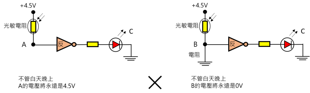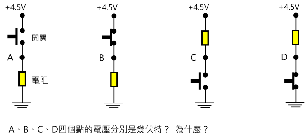 動動腦 想一想-電壓的高低 Post author:honeststore Post published:2022 年 6 月 22 日 Post category:Arduino Post comments:0 Comments 文章目錄標題 電壓的高低數位信號的輸入錯誤的電路 電壓的高低 數位系統是用電壓的高低來代表0或1,不是用電流。電流會讓電路發熱,很討厭!外界的資訊都要變成電壓,然後才能輸入到數位系統。 數位信號的輸入 ABCD 哪一點電壓高? 為什麼?1234 哪一個LED會亮? 為什麼? 錯誤的電路 Tags: 電壓高低 Please Share This Share this content Opens in a new window Opens in a new window Opens in a new window Opens in a new window Opens in a new window Opens in a new window Opens in a new window Opens in a new window Opens in a new window Opens in a new window You Might Also Like Arduino –通過紅外遙控器控制LED 2021 年 4 月 1 日 電阻的並聯與串聯 2022 年 6 月 21 日 Arduino範例講解(九) 2020 年 7 月 15 日 發佈留言 取消回覆CommentEnter your name or username to comment Enter your email address to comment Enter your website URL (optional) 在瀏覽器中儲存顯示名稱、電子郵件地址及個人網站網址,以供下次發佈留言時使用。 Δ