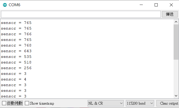 上傳程式碼後,以115200的鮑率打開串行監視器。以下為顯示類比讀數。