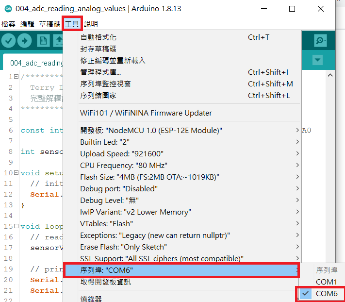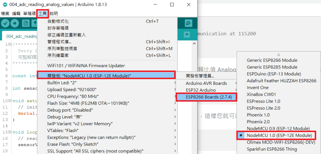 本節介紹瞭如何使用Arduino IDE使用ESP8266讀取模擬值。