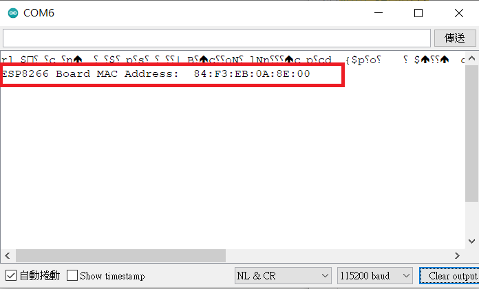 上載程式碼後,以115200的鮑率打開Serial Monitor,然後按ESP8266 RESET按鈕。MAC地址應如下打印: