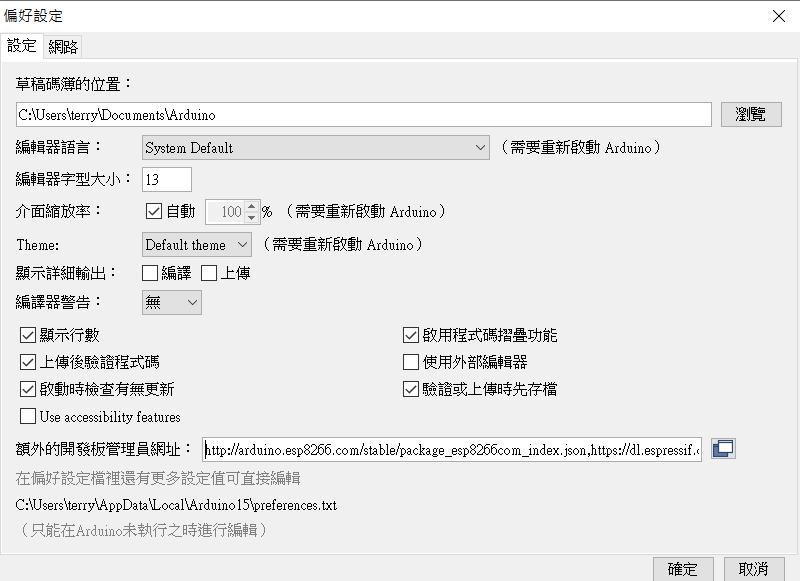 3. 輸入http://arduino.esp8266.com/stable/package_esp8266com_index.json進入“額外的開發板管理員網址”字段,如下圖所示。然後,點擊“確定”按鈕。