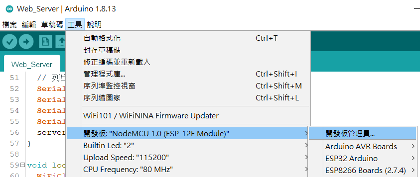 以下幾行開始與Wi-Fi連接 WiFi.begin(ssid,密碼),等待連接成功,然後在序列監視器中印出ESP IP地址。