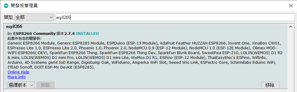 5. 向下滾動,選擇ESP8266開發板選單,並安裝“ ESP8266 Community的esp8266 ”,如下圖所示。