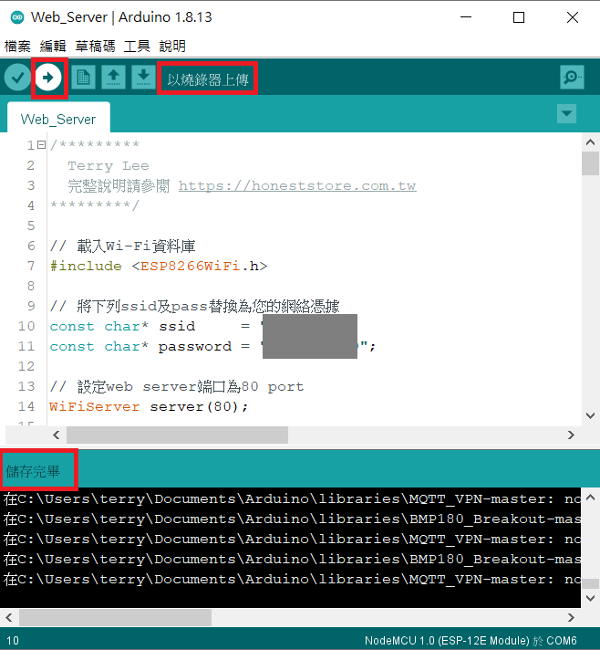 然後,點擊Arduino IDE中的上傳按鈕,等待幾秒鐘,直到看到消息“ 儲存完畢”。在左下角。