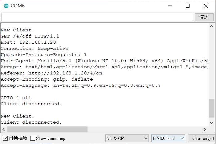 Serial.println("New Client.");          // 在序列端口中印出訊息