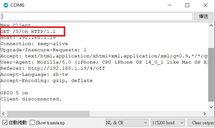 while (client.connected() && currentTime - previousTime <= timeoutTime) { // 當client端連線時,持續循環{}內動作 currentTime = millis(); if (client.available()) { // 如果有客戶端讀取的字節 char c = client.read(); // 閱讀一個字元, 然後 Serial.write(c); // 印出到序列顯示器 header += c; if (c == '\n') { // 如果字元是換行符號 // 如果當前行為空白,則您可以連續兩個換行符號 // 這是client端HTTP請求的結束,所以發送回應: if (currentLine.length() == 0) { // HTTP標頭始終以回應代碼開始 (e.g. HTTP/1.1 200 OK) // 和content-type,使客戶知道即將到來,然後是一個空白行 client.println("HTTP/1.1 200 OK"); client.println("Content-type:text/html; charset=utf-8"); client.println("Connection: close"); client.println(); // 打開和關閉GPIO if (header.indexOf("GET /5/on") >= 0) {