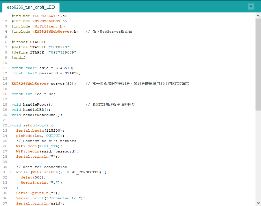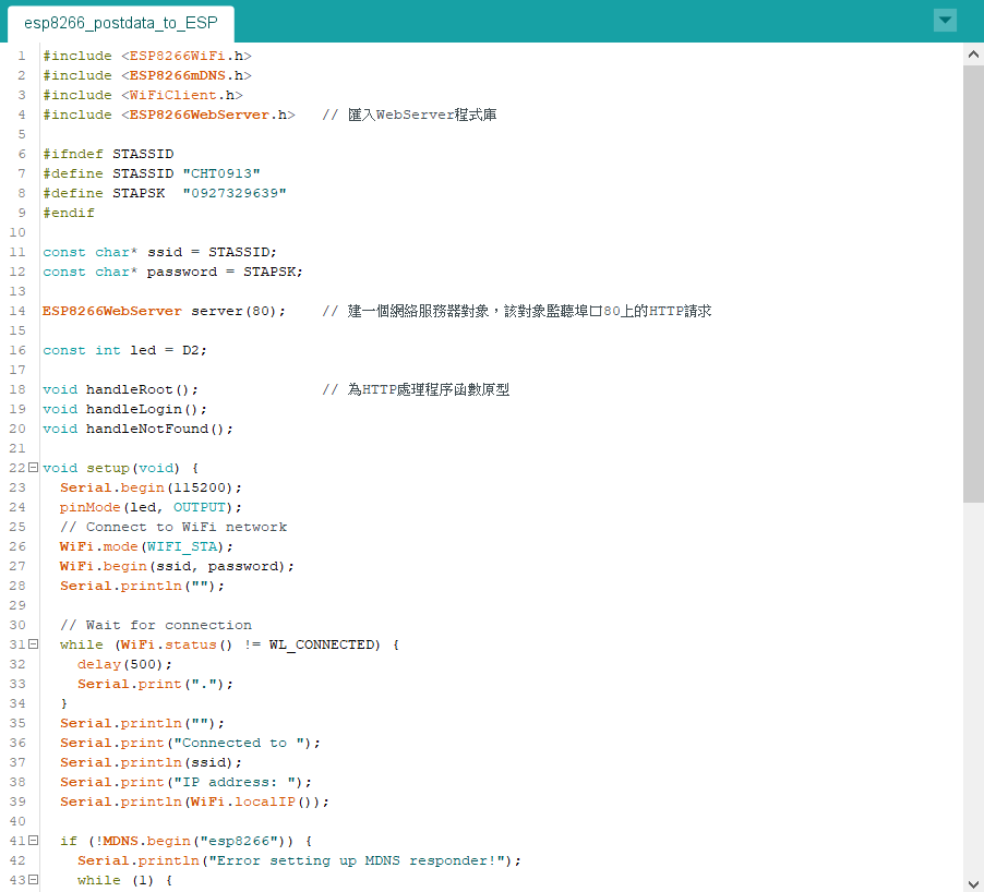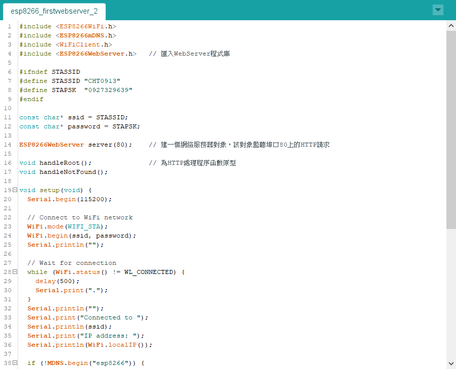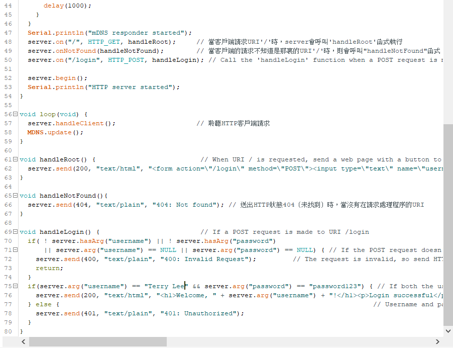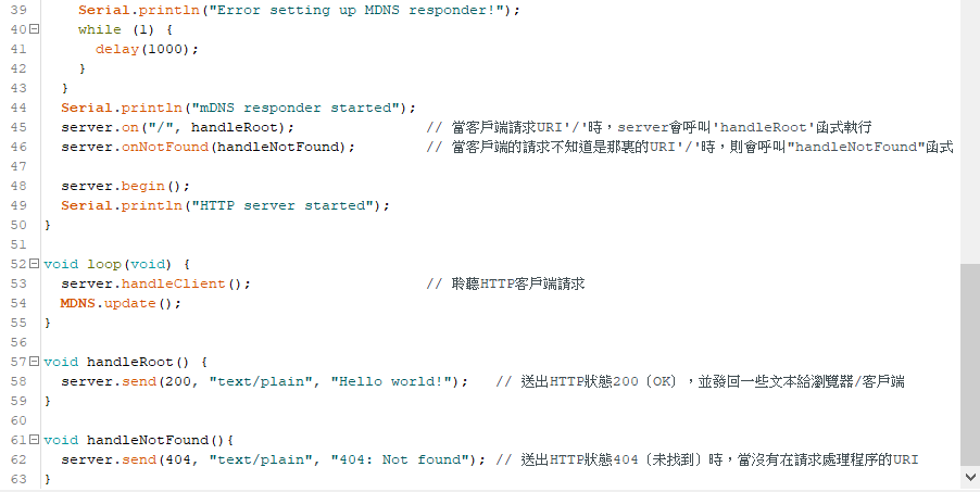 實際上服務器程式碼非常簡單。首先,我們建一個服務器實體,該實體在port 80上監聽HTTP請求。這是Web服務器的預設port。在設定中,我們告訴服務器如何處理某些HTTP請求。如果請求URI’/’,則服務器應使用HTTP狀態代碼200(Ok)進行回覆,然後發送帶有“ Hello world!”字樣的回應。我們寫一段回應的程式碼放在handleRoot函數中,並告訴服務器在請求“ /”時執行該回應,使用 server.on 函式。
