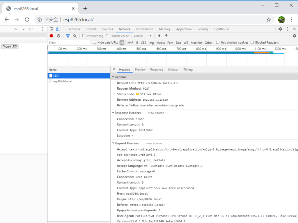 我們可以使用Web服務器來提供交互式頁面,並回應某些POST請求。在以下示例中,ESP8266託管一個有按鍵的網頁。當按下按鍵時,瀏覽器將POST請求發送到/ LED。當ESP在/ LED URI上收到這樣的POST請求時,它將打開或關閉LED,然後使用按鈕將瀏覽器重定向回主頁。