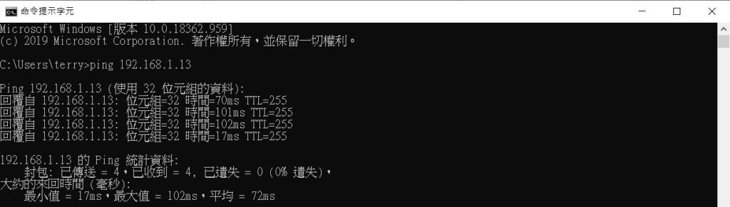 現在轉到電腦並打開一個terminal:在Windows上,搜索“命令提示符”。可以使用快捷方式:在Windows上,點擊  + R,輸入“ cmd”. 接下來,輸入 ping ,然後是您在”序列埠”監控視窗中收到的IP地址,按下Enter。輸出應如下所示: