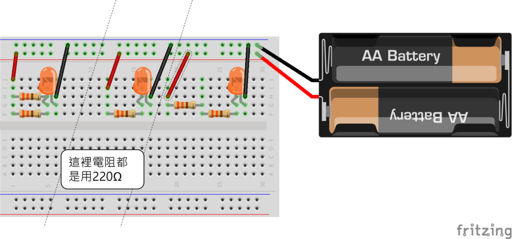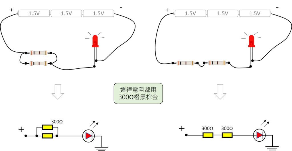 電阻的並聯與串聯 Post author:honeststore Post published:2022 年 6 月 21 日 Post category:Arduino Post comments:0 Comments 電阻的並聯 兩個300Ω的電阻並聯後,就好像電線變粗了電導值會增加,總電導值 = 電導1 + 電導2 電導值 = 1 / 電阻值 因此 1 / R = 1 / R1 + 1 R2 1 / R = 1 / 300 + 1 / 300 1 / R = 2 / 300 = 1 / 150 R = 150 兩個300Ω的電阻並聯後,相當於一個150Ω的電阻,不過這樣的狀況是在只有相同的電阻並聯才可以直接除以 2 電阻的並聯 兩個300Ω的電阻串聯後,說好像電線變長了 電阻值會增加 R = R1 + R2 = 300 + 300 = 600 兩個300Ω的電阻串聯後,相當於一個600Ω的電阻 哪一個發光二極體最亮?為什麼? Tags: 電阻的並聯, 電阻的串聯 Please Share This Share this content Opens in a new window Opens in a new window Opens in a new window Opens in a new window Opens in a new window Opens in a new window Opens in a new window Opens in a new window Opens in a new window Opens in a new window You Might Also Like Arduino範例講解(八) 2020 年 7 月 15 日 LED發光二極體及電阻 2022 年 6 月 20 日 動動腦 想一想-電壓的高低 2022 年 6 月 22 日 發佈留言 取消回覆CommentEnter your name or username to comment Enter your email address to comment Enter your website URL (optional) 在瀏覽器中儲存顯示名稱、電子郵件地址及個人網站網址,以供下次發佈留言時使用。 Δ