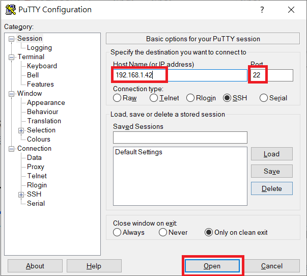 3)輸入 設備的IP地址,在我的情況下為 192.168.1.42 作為主機。端口需要保留預設值 22