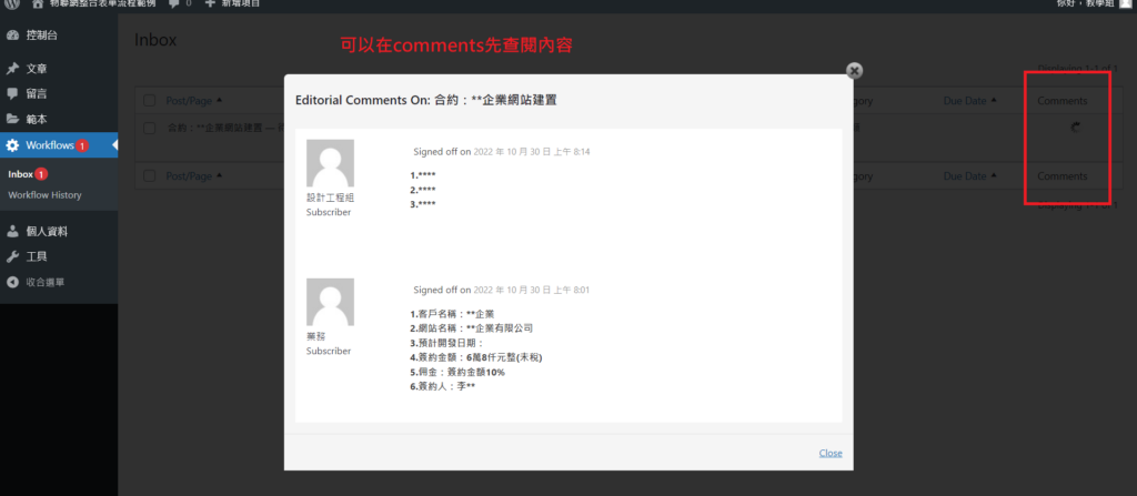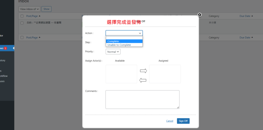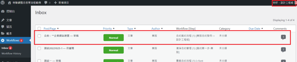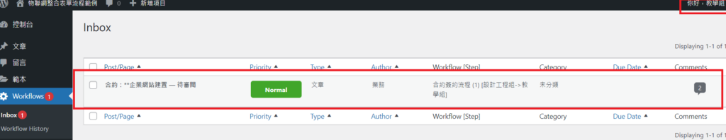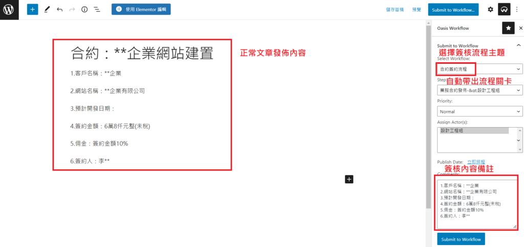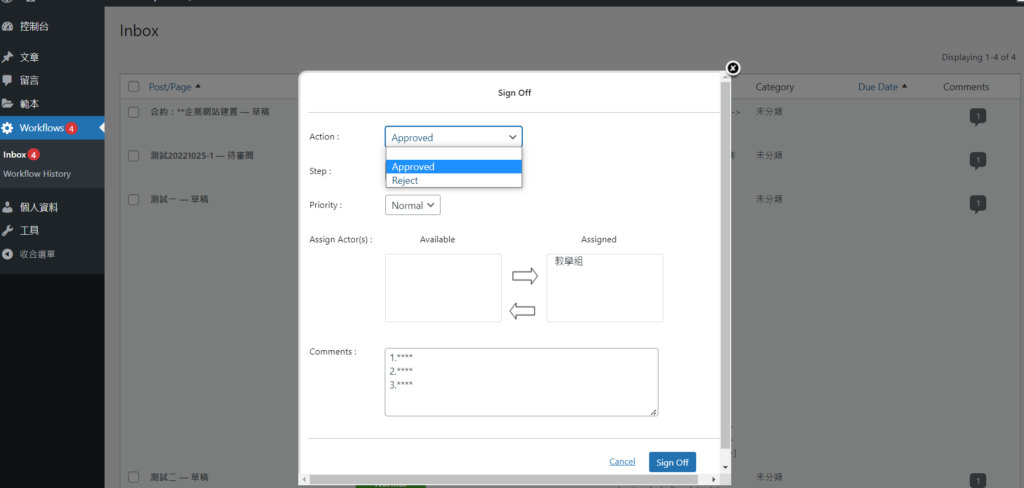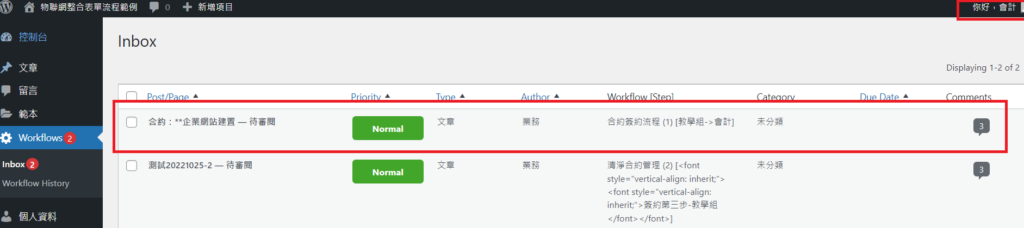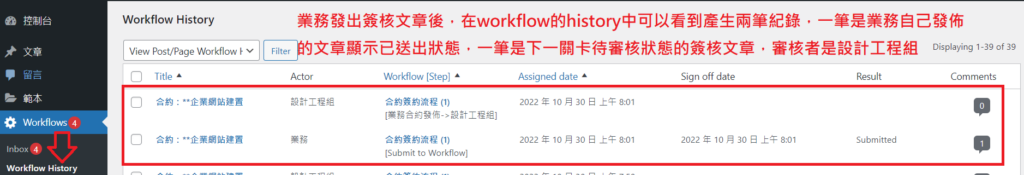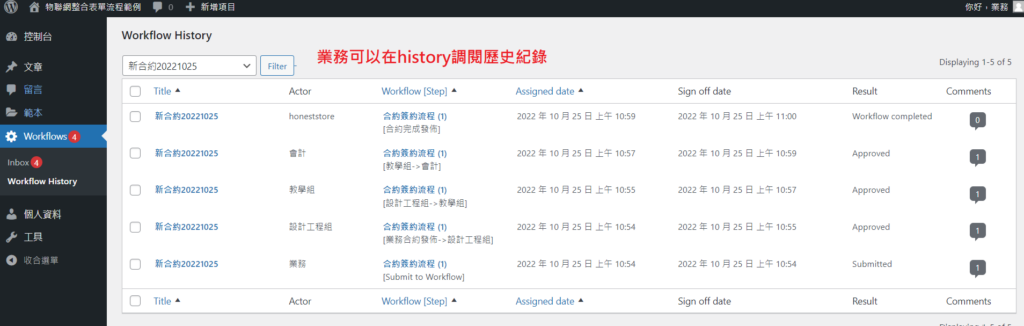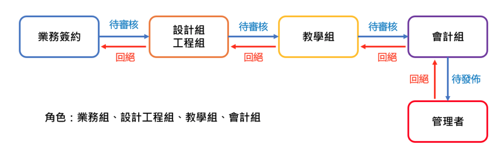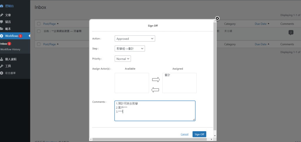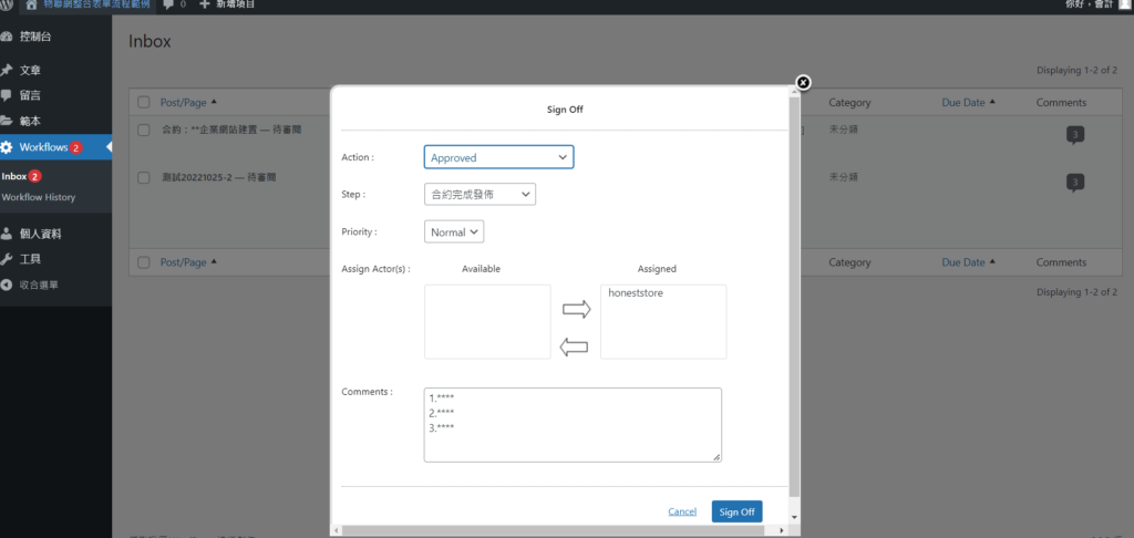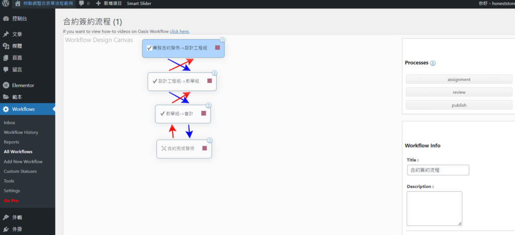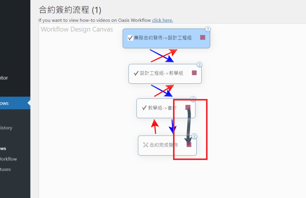 WordPress簽核流程功能 Post author:honeststore Post published:2022 年 10 月 30 日 Post category:WordPress / 簽核流程 Post comments:0 Comments 線上簽核流程功能如何在WordPress上實現。本課程會教各位做一個簽核流程功能的範例,預設有三個簽核流程需要簽核,最後再發佈文章。而要如何使用簽核流程外掛來達到這樣的功能,我之前有找到一個國外免費的外掛(Oasis Workflow)可以使用。這篇文章會介紹如何操作設定。 文章目錄標題 安裝外掛簽核流程說明Members設定Oasis Workflow簽核流程外掛設定實際作業測試 安裝外掛 要使用簽核流程功能需要使用到兩個外掛: Members:設定roles,主要是要新建不同角色的權限群組,看使用者是哪一個群組的,把它區分開來。 Oasis Workflow:簽核流程新增、設定、使用功能外掛。 簽核流程說明 我們用一張投影片來說明簽核流程的每個關卡以及角色,以下是用一個簡單且基本的簽核流程說明,每家公司有各自的流程,可以自行設計並設定。 角色的話假設公司內有業務群組、網站設計工程群組、教學群組及會計群組等。而今天當業務到外面接洽客戶,並確認該客戶有預計要建置一個公司或個人的網站。所以業務回來後,就是先開啟文章的地方,填入「客戶名稱、建置網站名稱、預計開發日期起迄、簽約金額……等資訊」,然後就送出。建置專案送出後,接著就是網站設計人員及工程師的工作,而當網站建置ok後,下個關卡是教學人員的分配,待教育訓練ok後,最後再由會計人員審定並發送給管理權限的人發佈整個專案完結。 所以預計會有的角色假設有業務人員、網站美工設計暨工程師、教育訓練人員、還有會計人員等。 簽核流程可參考上圖的流程圖。 Members設定 角色的設定,這裡會新增業務組、設計工程組、教學組及會計組等。而業務組跟其他設計工程組、教學組及會計組的權限區別在於無法修改其他人的文章權限,因為其他三組人員要審核的話需要具備在文章中有可以修改他人文章的權限。剩下的就是可以編輯、刪除自己的文章,還有閱讀的權限等,以及在簽核流程功能中具備簽核、送出及閱讀歷史文件的權限等。設定如下圖示: 業務組人員權限: 設計工程組、教學組及會計組人員權限: 全部角色權限統計圖: Oasis Workflow簽核流程外掛設定 簽核流程就是依據我上面提到的範例來設定,如下圖: 首先,我們新增一個workflow,並且填入workflow名稱。 接著我們拉出三個review及一個publish,三個review分別是業務合約發佈->設計工程組、設計工程組->教學組及教學組->會計組,還有一個合約完成發佈的publish。下面是完成圖: 在分別拉出review及publish的流程圖時,分別填入相關的流程名稱、角色及其他設定等,如下圖示: 業務組填寫合約發佈->設計工程組(review) 設計工程組->教學組(review) 教學組->會計組(review) 合約完成發佈(publish) 接著是待審核及回絕的設定,由業務->設計工程組->教學組->會計的流程是待審核;反之則為回絕。分別是滑鼠點選該審核點,然後不放掉直接移到另一個簽核點,就的出來簽絕的設定,如下所示: 待審核的設定如下圖示: 回絕的設定如下圖示: 最後就是設定起始日期、角色及發佈類型等: 確認無誤後,最後是按下儲存。 實際作業測試 首先我們用業務人員的角色登入網站,並撰寫一篇文章發佈(合約:**企業網站建置)。 接著在設計工程組角色可以看到有一筆待審核的文章(合約:**企業網站建置 – 待審閱) 接著在教學組角色可以看到有一筆待審核的文章(合約:**企業網站建置 – 待審閱) 接著在會計組角色可以看到有一筆待審核的文章(合約:**企業網站建置 – 待審閱) 最後在管理者角色可以看到有一筆待發佈的文章(合約:**企業網站建置) 以上就是簽核流程範例的實際作業測試。 Tags: WorkFlow, 簽核流程 Please Share This Share this content Opens in a new window Opens in a new window Opens in a new window Opens in a new window Opens in a new window Opens in a new window Opens in a new window Opens in a new window Opens in a new window Opens in a new window You Might Also Like WordPress 網站搬家:從 Bluehost 搬家到 Cloudways 2021 年 3 月 21 日 天氣氣象站網站DIY-ESP8266 2022 年 5 月 12 日 WordPress佈景主題 2022 年 6 月 28 日 發佈留言 取消回覆CommentEnter your name or username to comment Enter your email address to comment Enter your website URL (optional) 在瀏覽器中儲存顯示名稱、電子郵件地址及個人網站網址,以供下次發佈留言時使用。 Δ