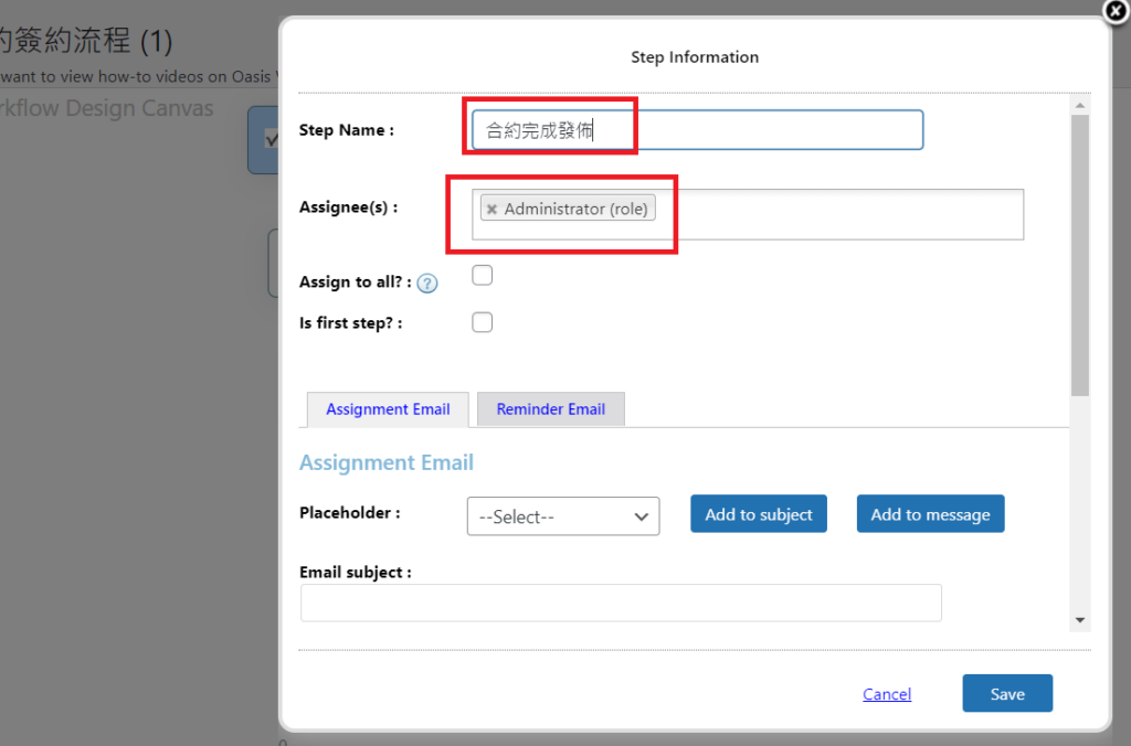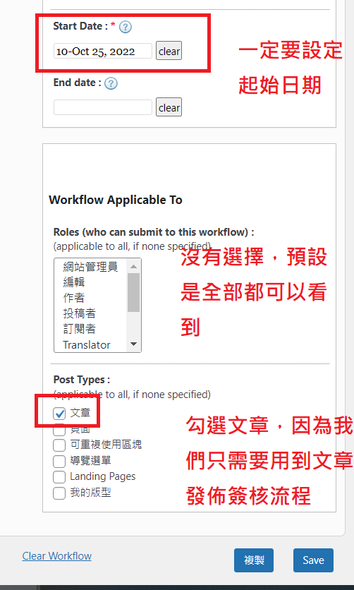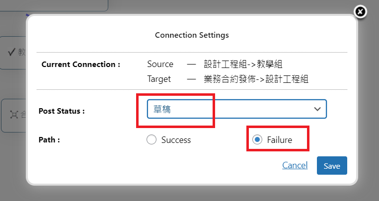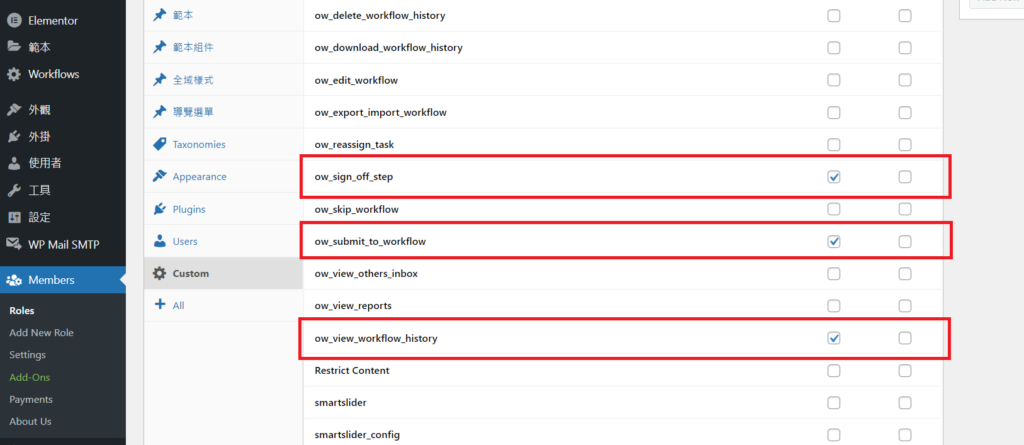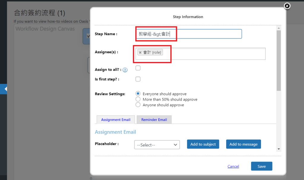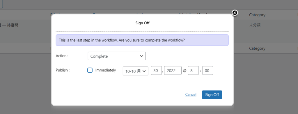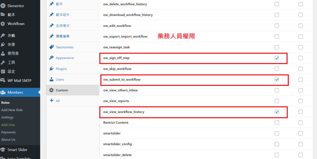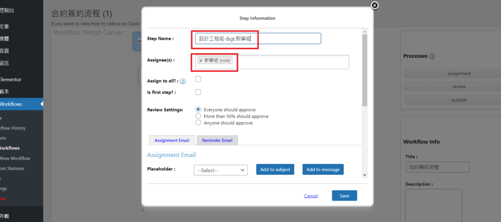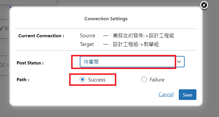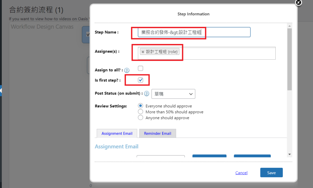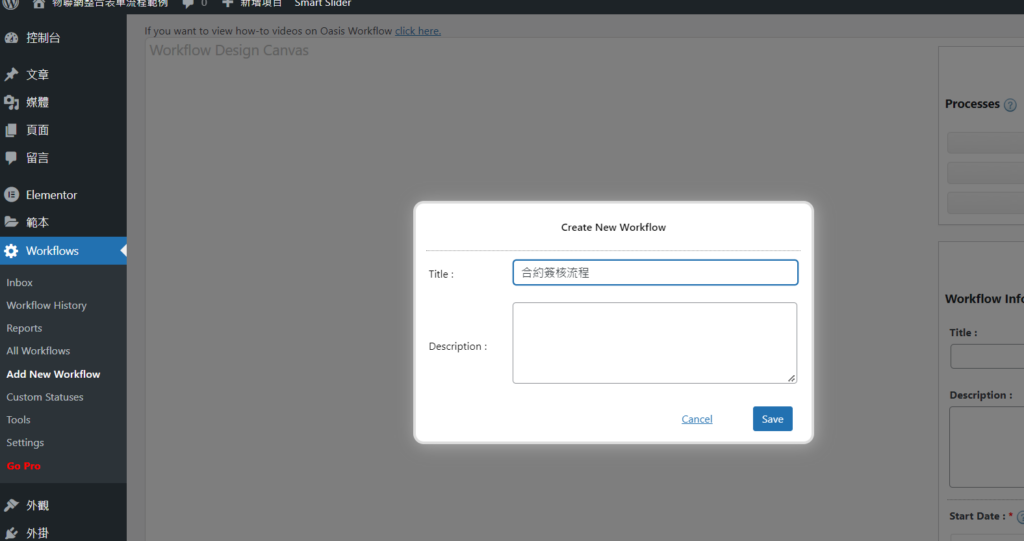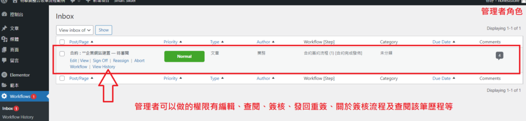 WordPress簽核流程功能 Post author:honeststore Post published:2022 年 10 月 30 日 Post category:WordPress / 簽核流程 Post comments:0 Comments 線上簽核流程功能如何在WordPress上實現。本課程會教各位做一個簽核流程功能的範例,預設有三個簽核流程需要簽核,最後再發佈文章。而要如何使用簽核流程外掛來達到這樣的功能,我之前有找到一個國外免費的外掛(Oasis Workflow)可以使用。這篇文章會介紹如何操作設定。 文章目錄標題 安裝外掛簽核流程說明Members設定Oasis Workflow簽核流程外掛設定實際作業測試 安裝外掛 要使用簽核流程功能需要使用到兩個外掛: Members:設定roles,主要是要新建不同角色的權限群組,看使用者是哪一個群組的,把它區分開來。 Oasis Workflow:簽核流程新增、設定、使用功能外掛。 簽核流程說明 我們用一張投影片來說明簽核流程的每個關卡以及角色,以下是用一個簡單且基本的簽核流程說明,每家公司有各自的流程,可以自行設計並設定。 角色的話假設公司內有業務群組、網站設計工程群組、教學群組及會計群組等。而今天當業務到外面接洽客戶,並確認該客戶有預計要建置一個公司或個人的網站。所以業務回來後,就是先開啟文章的地方,填入「客戶名稱、建置網站名稱、預計開發日期起迄、簽約金額……等資訊」,然後就送出。建置專案送出後,接著就是網站設計人員及工程師的工作,而當網站建置ok後,下個關卡是教學人員的分配,待教育訓練ok後,最後再由會計人員審定並發送給管理權限的人發佈整個專案完結。 所以預計會有的角色假設有業務人員、網站美工設計暨工程師、教育訓練人員、還有會計人員等。 簽核流程可參考上圖的流程圖。 Members設定 角色的設定,這裡會新增業務組、設計工程組、教學組及會計組等。而業務組跟其他設計工程組、教學組及會計組的權限區別在於無法修改其他人的文章權限,因為其他三組人員要審核的話需要具備在文章中有可以修改他人文章的權限。剩下的就是可以編輯、刪除自己的文章,還有閱讀的權限等,以及在簽核流程功能中具備簽核、送出及閱讀歷史文件的權限等。設定如下圖示: 業務組人員權限: 設計工程組、教學組及會計組人員權限: 全部角色權限統計圖: Oasis Workflow簽核流程外掛設定 簽核流程就是依據我上面提到的範例來設定,如下圖: 首先,我們新增一個workflow,並且填入workflow名稱。 接著我們拉出三個review及一個publish,三個review分別是業務合約發佈->設計工程組、設計工程組->教學組及教學組->會計組,還有一個合約完成發佈的publish。下面是完成圖: 在分別拉出review及publish的流程圖時,分別填入相關的流程名稱、角色及其他設定等,如下圖示: 業務組填寫合約發佈->設計工程組(review) 設計工程組->教學組(review) 教學組->會計組(review) 合約完成發佈(publish) 接著是待審核及回絕的設定,由業務->設計工程組->教學組->會計的流程是待審核;反之則為回絕。分別是滑鼠點選該審核點,然後不放掉直接移到另一個簽核點,就的出來簽絕的設定,如下所示: 待審核的設定如下圖示: 回絕的設定如下圖示: 最後就是設定起始日期、角色及發佈類型等: 確認無誤後,最後是按下儲存。 實際作業測試 首先我們用業務人員的角色登入網站,並撰寫一篇文章發佈(合約:**企業網站建置)。 接著在設計工程組角色可以看到有一筆待審核的文章(合約:**企業網站建置 – 待審閱) 接著在教學組角色可以看到有一筆待審核的文章(合約:**企業網站建置 – 待審閱) 接著在會計組角色可以看到有一筆待審核的文章(合約:**企業網站建置 – 待審閱) 最後在管理者角色可以看到有一筆待發佈的文章(合約:**企業網站建置) 以上就是簽核流程範例的實際作業測試。 Tags: WorkFlow, 簽核流程 Please Share This Share this content Opens in a new window Opens in a new window Opens in a new window Opens in a new window Opens in a new window Opens in a new window Opens in a new window Opens in a new window Opens in a new window Opens in a new window You Might Also Like WordPress 網站搬家:從 Bluehost 搬家到 Cloudways 2021 年 3 月 21 日 天氣氣象站網站DIY-ESP8266 2022 年 5 月 12 日 WordPress佈景主題 2022 年 6 月 28 日 發佈留言 取消回覆CommentEnter your name or username to comment Enter your email address to comment Enter your website URL (optional) 在瀏覽器中儲存顯示名稱、電子郵件地址及個人網站網址,以供下次發佈留言時使用。 Δ