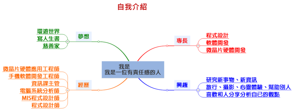 只要上過心靈成長的課程的人,大致上都會上過這個課程,內容除了像這個遊戲一樣的介紹自己之外,也有的課程是用心智圖來自我介紹。中間填入『我是xxx,我是一位什麼樣的人,接著介紹自己的專長、興趣、經歷及自己的夢想,劃成心智圖來自我介紹。